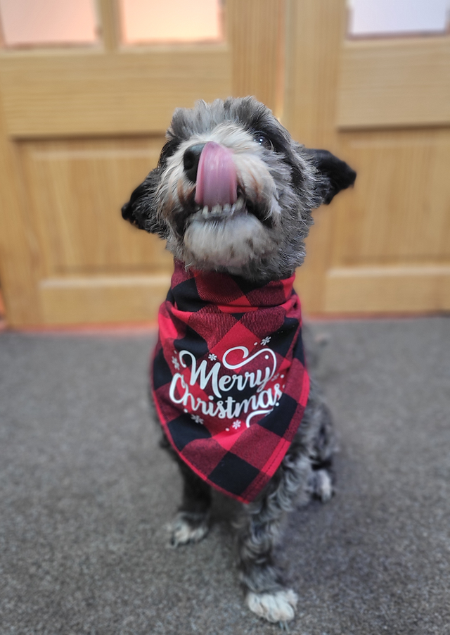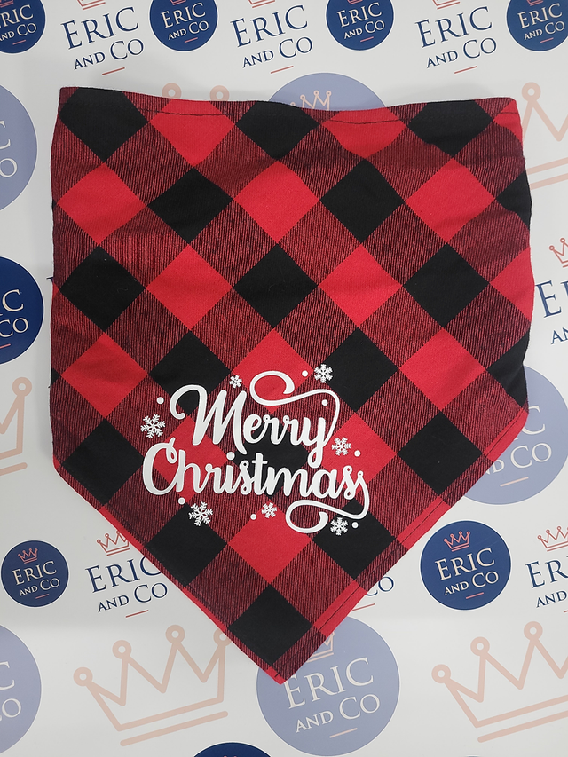 Christmas Dog / Puppy Bandanas: These classic plaid Christmas bandanas are designed with Merry Christmas written on them.